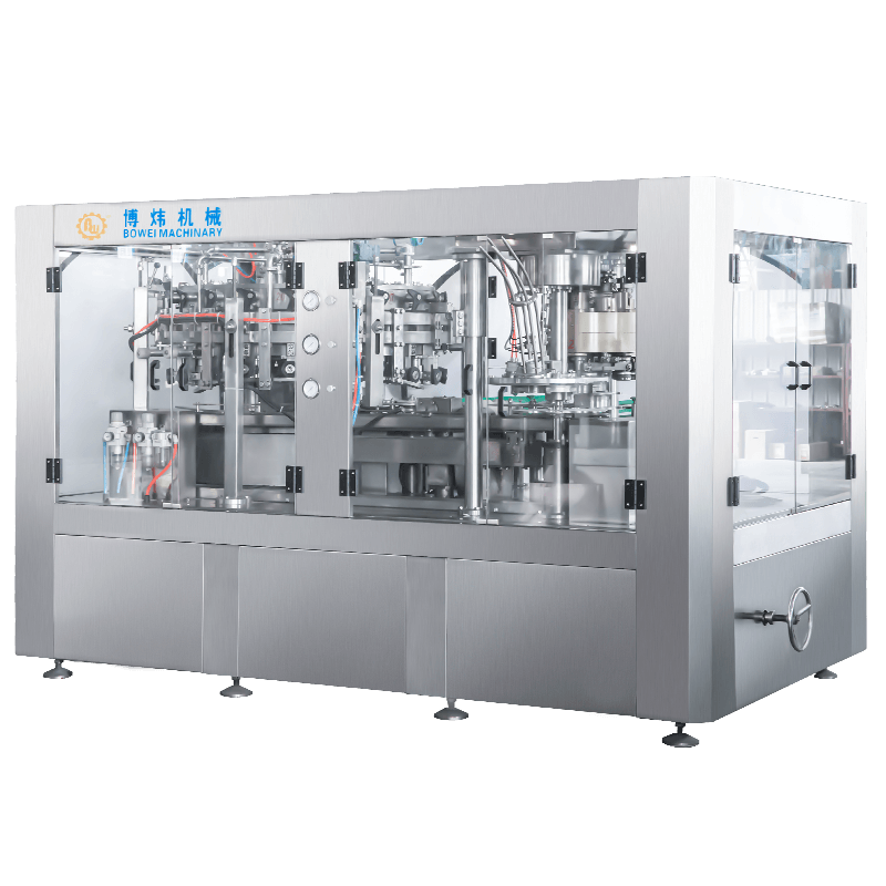 本機適用于易拉罐飲料(啤酒)行業中的含汽易拉罐灌裝和封口,灌裝和封罐為整體設計,采用等壓灌裝原理,灌裝時當空罐進入到升罐氣動罐托上,壓縮空氣經氣動三聯件進入升罐氣缸,并把空罐升起和灌裝閥下的錐形密封墊密封,灌裝閥的轉位快塊在另一氣缸的作用下轉位開閥,向空罐充氣并形成等壓,啤酒從大料罐通過14個小導管流向空罐,空罐內液位上升到堵住回氣口時,就停止灌裝。排沫閥在碰塊的作用下開始慢慢放氣泄壓,托罐氣缸繼續下降,出罐后被同步運轉的鉤子鏈送到封口機上進行封口,封口時,封口輪先預封再實封,罐子封好后被打蓋機構的打頭推出,后經撥盤撥至輸送帶上送出。