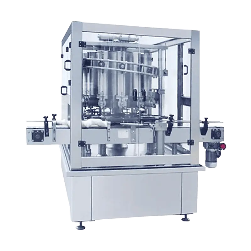 本機采用活塞灌裝原理,馬口鐵空罐或玻璃瓶,經輸送到達灌裝位置后,壓縮空氣經氣動三聯件進入氣缸,把灌裝閥打開,活塞在凸輪的作用下在活塞缸內向下移動進行灌裝,待灌裝完畢后灌裝閥在汽缸的作用下自動關閉,活塞缸再進行吸料。活塞及活塞缸經過特殊處理,配合精密,經久耐磨。料缸采用不銹鋼制造,并配備物料攪拌系統,三點液位控制,有罐灌裝等多項自控設計。